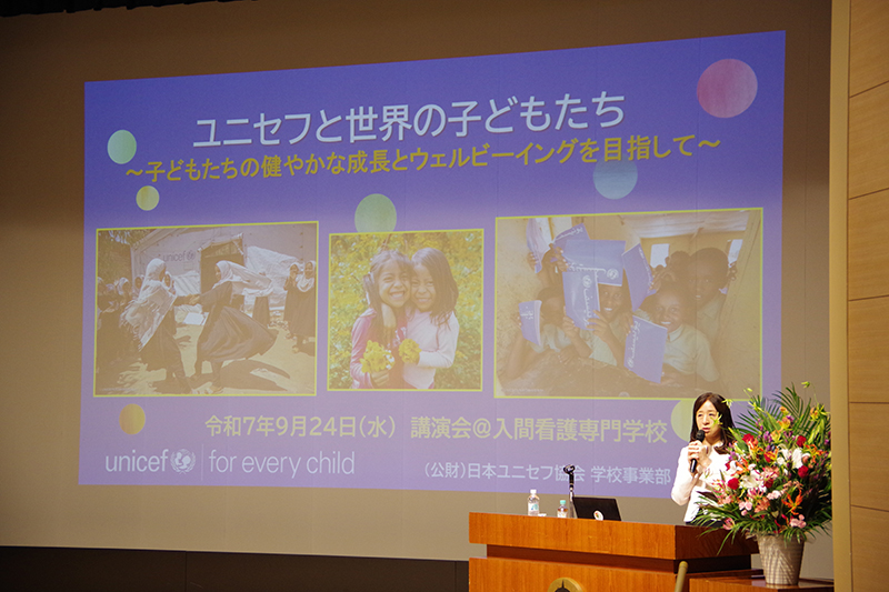 2025年9月24日(水)、本学と入間看護専門学校の共催で「ユニセフと世界の子どもたち 〜子どもたちの健やかな成長とウェルビーイングを目指して〜」(講師:池田礼子 氏)を実施しました。