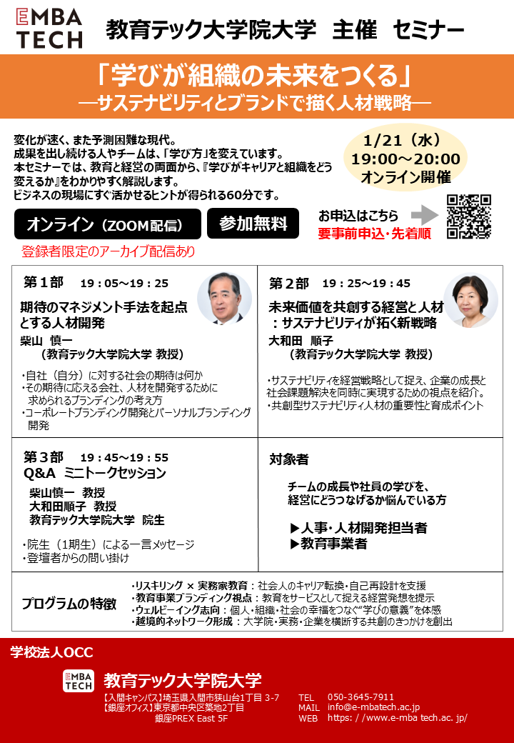 成果を出し続ける人やチームは、「学び方」を変えています。本セミナーでは、教育と経営の両面から、『学びがキャリアと組織をどう変えるか』をわかりやすく解説します。