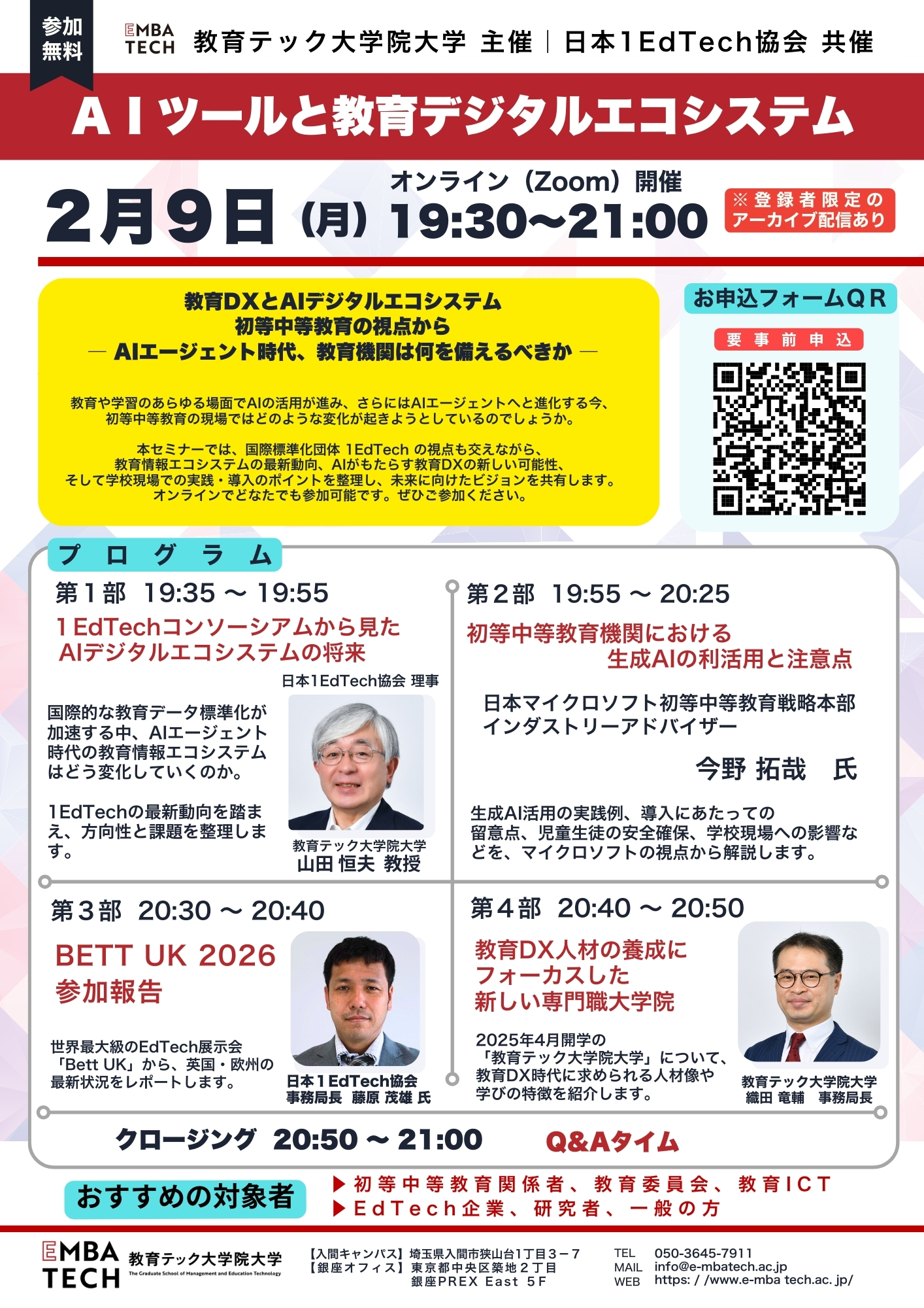 本セミナーでは、国際標準化団体 1EdTech の視点も交えながら、教育情報エコシステムの最新動向、AIがもたらす教育DXの新しい可能性、そして学校現場での実践・導入のポイントを整理し、未来に向けたビジョンを共有します。