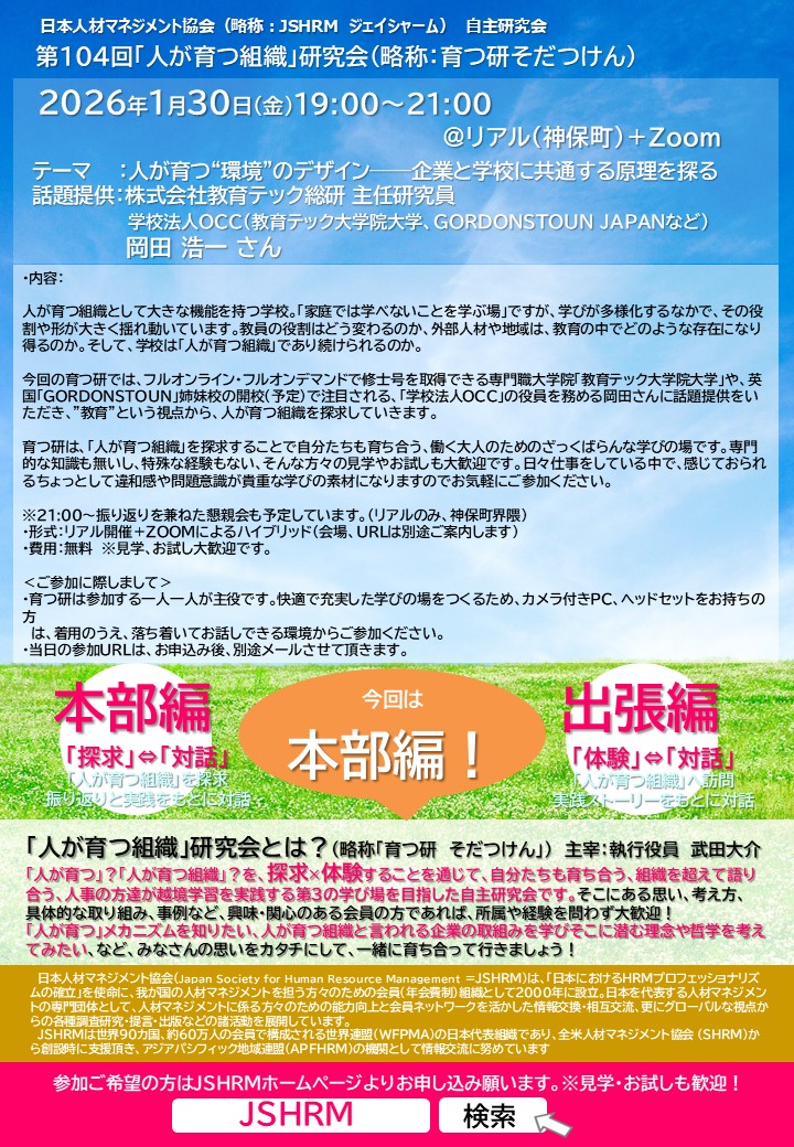 【申込受付中_1/30(金)開催】第104回「人が育つ組織」研究会|「 人が育つ“環境”のデザイン──企業と学校に共通する原理を探る」/日本マネジメント協会主催