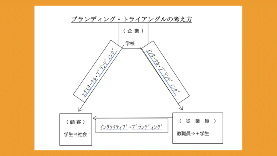 例えば、エクスターナル・ブランディングの対象である顧客をもっと広いステークホルダーとし、未来の学生や保護者、さらには社会全体と捉えてみると、トライアングルの拡がりが大きくなって見えてきます。インターナル・ブランディングの対象も、教職員に限られていたものが、学生や保護者、さらには卒業生にまで広がっていきます。考え方次第で、学生や保護者は、エクスターナルの対象から、インターナルの対象に移行する、つまり、学校としては内部者として位置付けられることになるわけです。