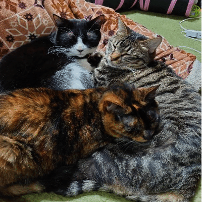 いま、うちには猫が3匹います(図2)。どれも保護猫ですが、それぞれに個性があって、いっしょにいて、いつも新しい発見の連続です。