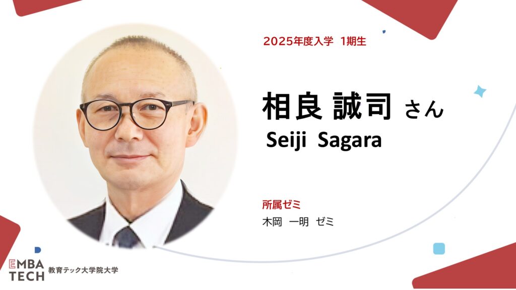 教育テック大学院大学1期生の相良 誠司(さがらせいじ)と申します。1期生とはいえ、なんと60歳半ばのおじさん(おじいさん?)です。教育テック大学院大学は、そんな年齢でも入学することができます。